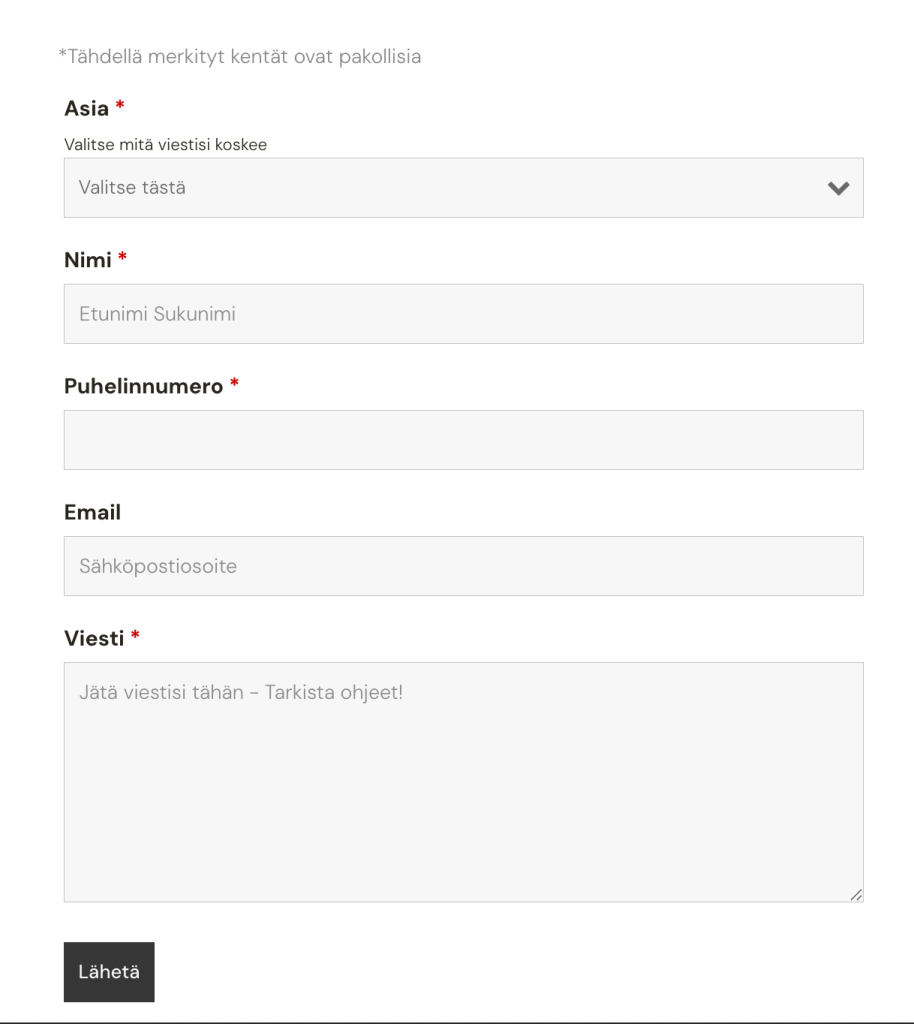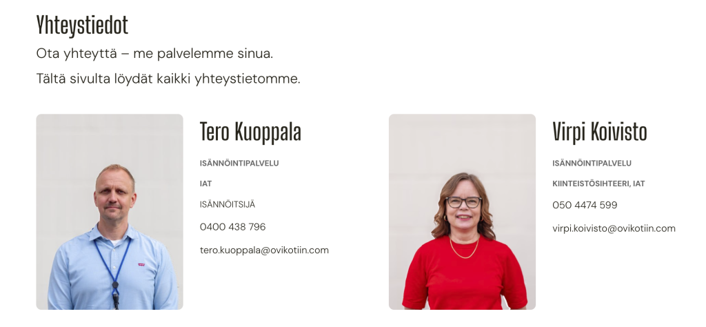 Alalle ominaiset yhteydenottotavat tunnistettiin ja yhteystiedot rakennettiin niin, että oikea palvelu olisi helposti löydettävissä. Sivuille luotiin myös helposti käytettäviä lomakkeita, joiden kautta erilaiset ilmoitukset hoituvat sujuvasti. Näissä tärkeänä osana oli myös vastaanottajien käyttökokemus. Lakisääteiset ilmoitukset esim. muutostöistä pitää olla selkeitä, arkistoitavissa ja nopeasti löydettävissä.